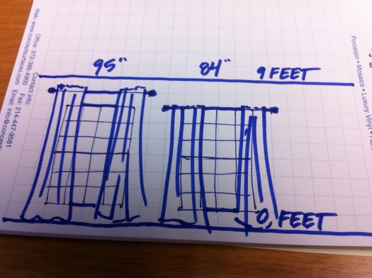 By looking at this picture, I can use my interior designer context clues to make a guess on the size she needs. Door headers are typically at 7′-0″ high and it looks like the top of the window aligns with the top of the door. The shortest curtain length is 84″, i.e. 7′-0″. Unless she wants to hang the curtains right at the top of the window (not recommended), she needs to go longer. I texted back a professional sketch:
