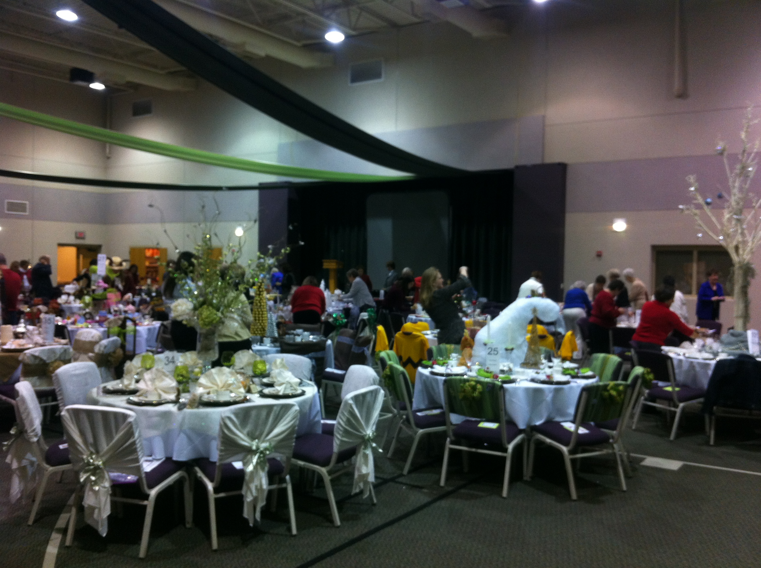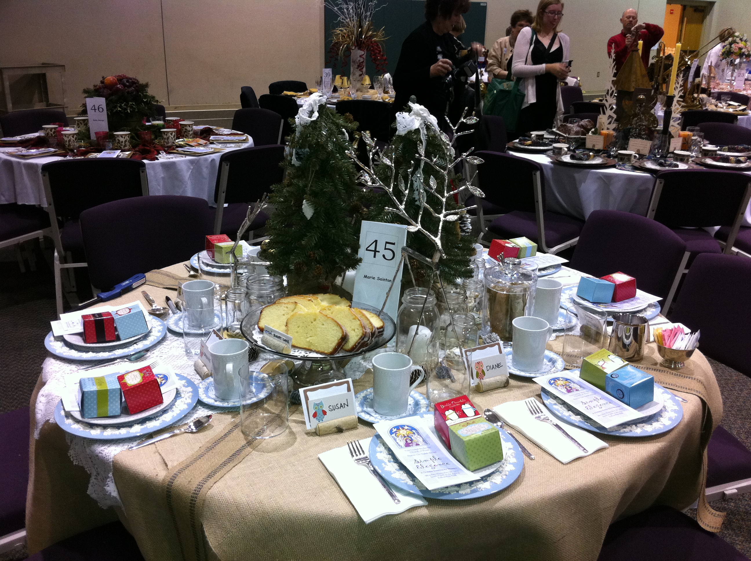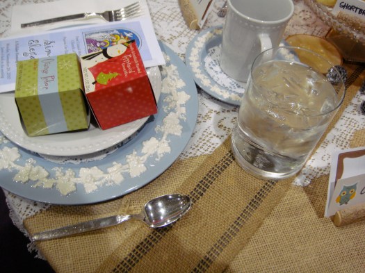 There were two tables set up and one table added cute decorations onto already cute Anthro mugs. The table I was at made ingenious “spoon orbs” (as I like to call them) to hang from the ceiling. We had a styrofoam balls, wrapped in masking tape, and spray painted either gold, bronze, or silver (they did this prep work for us). Then we were given spray painted plastic spoons: